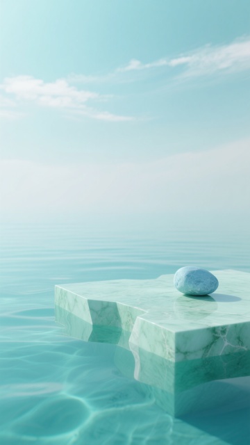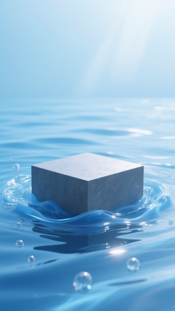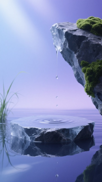 超写实摄影风格,以纯净的蓝色为主色调,柔和的自然光从画面上方照射下来,形成明亮的高光和细腻的阴影,营造出宁静而清新的氛围。画面中央是一块质感粗糙的深色岩石展台,展台表面湿润,反射着水光。展台周围的水以优雅的环形涟漪形态扩散开来,水面平静光滑,波光粼粼,点缀着细小的白色光斑,展现出清澈透明的质感,整体构图采用对称美学,突出中央展台与周围水元素的和谐关系,画面简洁而富有高级感。
