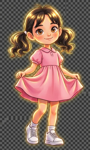 甜美卡通女孩,粉色裙装,软3D风格,清新花田背景,童趣盎然。