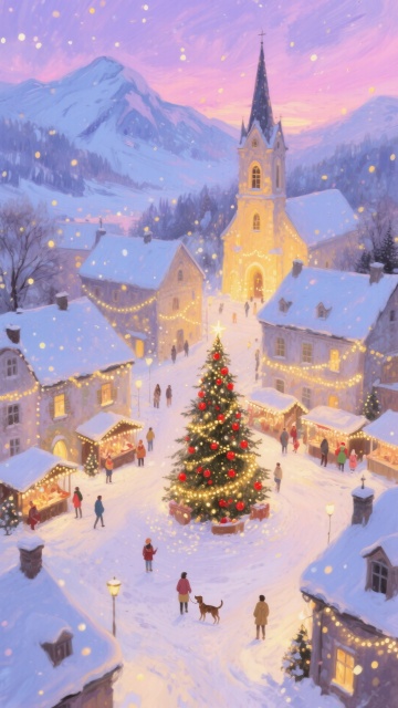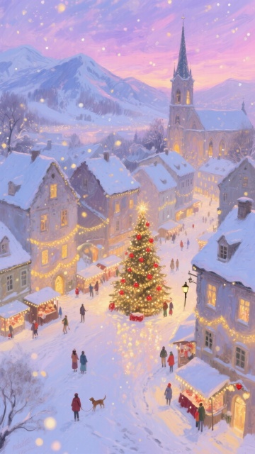俯视角长镜头,一位身着褪色红围巾的孤独老人站在被厚雪覆盖的废弃游乐园中央,仰望天空中由无数冰晶构成的巨大时钟,时钟指针由飘落的雪花凝固而成,背景是渐变的深灰到纯黑的夜空,雪花以数学般精确的轨迹从钟面溢出,既有精致的星形冰晶在老人肩头停留,也有细密的雪尘如雾霭般弥漫,老旧旋转木马的剪影在雪幕中若隐若现,一盏孤灯发出微弱的暖黄色光晕穿透飘落的雪帘,整体色调是深邃的墨黑与纯净的雪白交织,点缀着一丝孤独的暖黄。