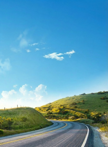 清晨阳光照射下的蜿蜒公路,路面为深灰色沥青材质,中央有双黄实线分隔,右侧边缘线为白色实线,道路向远方山谷中延伸并自然弯曲,两侧为茂密的绿色草地与低矮灌木丛,远处是起伏的绿色山丘,天空呈现从地平线处温暖橙黄色向顶部渐变至清澈蓝色的渐变效果,光线明亮柔和,在路面和草丛上形成清晰的明暗光影对比,整体画面呈现出宁静、开阔且充满希望的氛围,具有高度写实的摄影质感,细节丰富,色彩和谐自然。