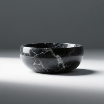 一个表面具有流畅自然、深浅不一的墨绿色与白色交织的大理石纹理的椭圆形碗状物体,碗体呈现出柔和的弧度,边缘光滑圆润,整体造型简约现代,放置在纯白色的平面上,背景为明亮的白色空间,光线从左上方柔和均匀地照射下来,在碗的右下方形成淡淡的阴影,凸显出大理石材质细腻温润的质感和碗体优雅的立体感。