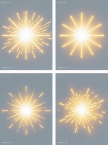 纯白背景,六个同系列放射状光效素材集合规整排布,每个光效均保持半透明渐变质感与柔和朦胧的光影风格,核心为明亮发光圆点,向外呈放射状扩散出细长金色光线,光线疏密有致且带有微妙的颜色渐变,整体色调统一为温暖的金黄色系,各光效造型与角度完全不同,有的光线向上集中,有的向四周均匀扩散,有的呈螺旋状分布,有的光线较短而密集,有的较长而稀疏,有的则在一侧形成不对称放射,所有元素在白色背景上保持清晰的视觉层次与和谐的整体美感,画面简洁明快,光线边缘柔和无硬边,光效中心亮度最高并向外自然衰减。