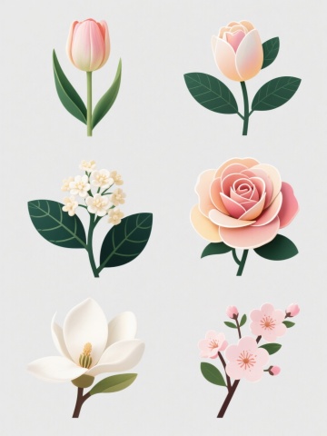 水彩风格花卉装饰元素,白色背景,五组不同形态的花卉组合,整体呈现清新自然的手绘质感,色彩过渡柔和透明,带有水彩特有的晕染效果和细微的笔触纹理。花卉包括玫瑰、向日葵、绣球花、百合等,花瓣层次丰富,细节精致,搭配深绿色和蓝绿色的各式叶片、藤蔓,整体构图平衡和谐。主体花卉颜色调整为:上方第一组以淡紫色玫瑰、鹅黄色向日葵和白色小花为主;中间第二组为浅粉色玫瑰、淡蓝色绣球花和橙色玫瑰;第三组为枚红色大丽花、白色小花和黄色花蕊点缀;下方左侧一组为深粉色玫瑰、橙色小花和黄色向日葵;最下方一组为浅粉色玫瑰、白色百合和粉色小雏菊,所有花卉保持原有的形态结构和水彩质感,色彩明亮柔和,与绿色枝叶形成鲜明对比,整体画面清新雅致,适合作为装饰元素使用。