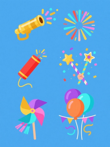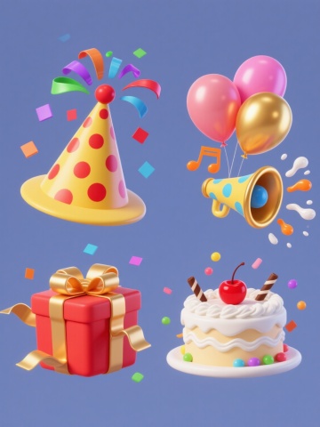 系列素材集合,规整排布在纯色背景上,保持简约现代的卡通插画风格,六个完全不同的节日庆典元素,每个元素都采用圆润的线条、鲜明的色彩对比和渐变过渡,具有轻微的立体感和光泽感,元素包括:1. 橙色和粉色条纹的派对帽,帽口飞出彩色卷曲彩带和圆点;2. 蓝色和紫色渐变的气球束,系着黄色丝带,气球上有白色高光;3. 红色和黄色的纸杯蛋糕,顶部有白色奶油和彩色糖屑;4. 绿色和蓝色的礼物盒,系着粉色蝴蝶结,盒盖微微打开,露出金色光芒;5. 紫色和粉色的生日蜡烛,蜡烛上有黄色火焰,周围有白色光点;6. 黄色和橙色的烟花,呈放射状绽放,有红色、蓝色和紫色的火花,所有元素大小一致,间距均匀,整体视觉风格统一。
