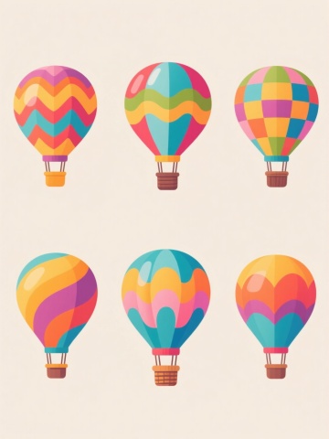一套6个造型各异的卡通气球系列素材集合,每个气球造型保持圆润饱满的形态、光滑渐变的表面质感、高光和阴影的细节处理,气球通过细线束扎在一起。6个气球造型在整体布局中规整排布,每个造型拥有完全不同的气球组合形态(如大小比例变化、数量增减、排列方式调整、气球形状微调等)。整体采用纯色背景,每个造型的气球颜色各不相同,均为明亮鲜艳的马卡龙色系或饱和色彩,保持统一的扁平化矢量插画风格,线条简洁流畅,色彩明快活泼,画面干净整洁,信息传达清晰直接。