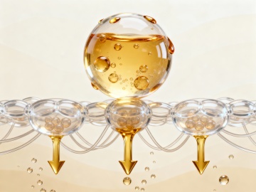 一个透明玻璃材质的圆形容器,内部装有金黄色液体,液体表面有细小气泡,容器周围连接着多个大小不一的透明玻璃球体,球体内部也有金黄色液体和气泡,整体悬浮在纯白色背景上,高光泽,强反光,超写实质感,清晰的边缘和细节,柔和的高光,精致的玻璃纹理,液体的流动性和透明度表现极佳。