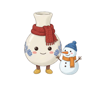 一个卡通风格的花瓶插画,花瓶主体为蓝色轮廓,内部填充柔和的淡紫色,脸上带着黑色圆点眼睛和微笑的弧线嘴巴,脸颊有粉红色圆形腮红,脖子处系着一个大的橙色蝴蝶结,蝴蝶结中心有白色圆点,花瓶中插着四朵花,花朵轮廓为深蓝色,花瓣填充淡粉色,花心为黄色圆形,周围有绿色的椭圆形叶子和橙色的十字形装饰图案,整体线条简洁流畅,色彩以紫色、橙色、粉色为主,保持原有的可爱、欢快氛围和扁平化设计风格。