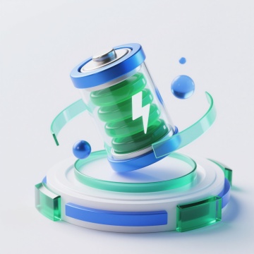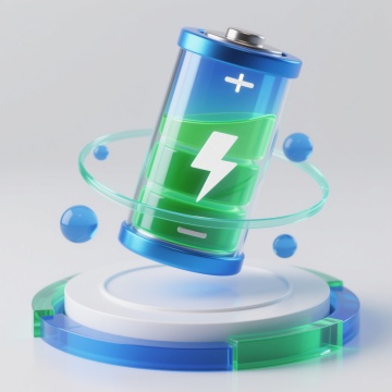 一个高度写实的3D风格绿色圆柱形电池,主体为鲜艳的绿色,上下两端为黑色金属盖,表面光滑有光泽。电池正面中央有一个醒目的白色闪电符号,闪电图案边缘锐利清晰。电池周围环绕着淡淡的绿色光晕和白色发光粒子,背景为纯白色,整体光影效果突出,营造出科技感和能量充沛的氛围,画面简洁明了,主体突出。