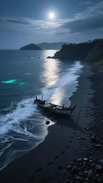 低角度仰拍,葡萄牙阿尔加维的隐秘海蚀洞内部,粗糙的赭红色岩壁环绕着画面边缘,中央豁然开朗处,一轮巨大的橙红色落日正沉入靛蓝色的海平面,余晖透过岩壁裂隙在湿漉漉的金色沙滩上投射出长长的菱形光斑,几串新鲜的脚印从洞穴深处蜿蜒至被海水浸湿的沙岸线,浪花带着珍珠般的泡沫轻轻漫过脚印边缘,远处海面上漂浮着几艘剪影般的渔船,天空从地平线的橙红渐变为头顶的深紫,几颗早亮的星星已在洞顶的夜空中闪烁,整体色调温暖而神秘,营造出一种与世隔绝的宁静与探索的惊喜感。
