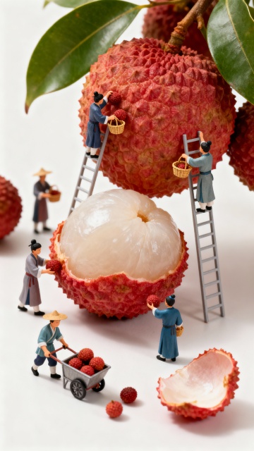 一串新鲜饱满的荔枝,果皮呈现鲜艳的红棕色,带有粗糙的颗粒质感,一颗荔枝被剥开,露出晶莹剔透、洁白如玉的果肉,荔枝果实和枝叶上挂着晶莹的水珠,水珠正从果实上滴落,形成清晰的水滴轨迹和悬浮的水珠,背景改为明亮的浅蓝色天空,带有柔和的自然光线,整体画面保持高清晰度和写实的摄影风格,光影效果突出,色彩鲜明,营造出清新自然的氛围。