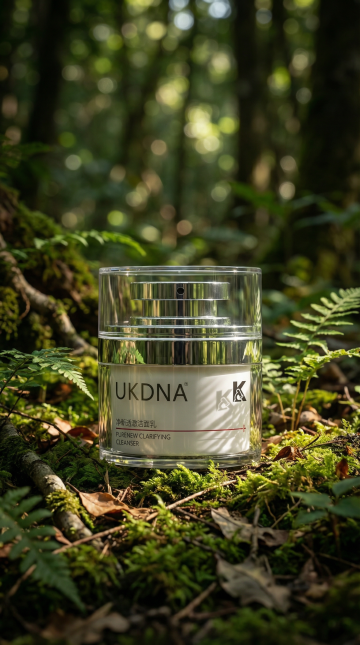 微距俯拍,JOON AME品牌的83号焕颜修护面霜被精心置于一块布满深绿青苔的玄武岩上,磨砂质感的象牙白陶瓷罐身搭配哑光金螺旋盖,罐口边缘凝结着一滴莹润的乳霜。周围错落分布着带露水的铃兰、紫锥花与蕨类植物,几株纤细的银叶菊从岩石缝隙中探出头来。背景是雾蒙蒙的晨林浅景深效果,光线采用侧逆光勾勒出产品轮廓的金边,空气中漂浮着细密的水汽微粒。色调以冷调森林绿为基底,点缀陶瓷罐的象牙白与金属盖的鎏金光泽,右下角优雅排版着"三重神经酰胺屏障、24小时缓释保湿、修复屏障焕活新生"的烫金文字。