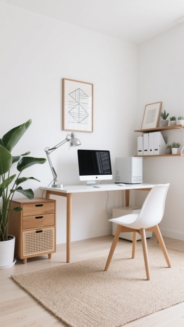 极简主义风格的现代办公室内部,开放式办公布局,浅木色办公桌整齐排列,配备灰色办公椅与黑色电脑显示器,大面积落地窗引入明亮自然光,天花板装有长条形LED白色照明灯管,地面铺设浅灰色地毯,角落摆放绿色大型绿植,整体色调以白色、浅木色、灰色为主,呈现简洁、专业、通透的氛围,不同环境角度下的办公室背景,保持相同的极简现代风格与色彩搭配。