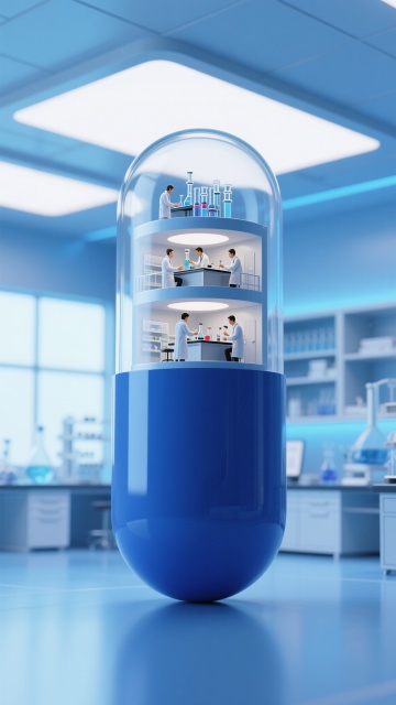 医疗科技感背景,高清写实风格,以蓝色和白色为主色调,柔和明亮的光线从上方照射,营造出洁净、专业、充满希望的氛围。画面中心可替换为不同形态的医疗场景元素,如:显微镜下的细胞结构、DNA双螺旋模型、手术器械特写、药剂师调配药物的手部动作、医学影像图(CT、MRI)的可视化呈现、疫苗研发实验室的精密仪器、医护人员身着防护服的背影、智能医疗设备的界面展示等。背景融入半透明的六边形几何图形、数据流线条、分子结构模型等科技元素,采用虚实结合的构图,前景元素清晰锐利,背景元素带有轻微的模糊和光晕效果,增强空间层次感和科技感,整体设计需保持信息传达的清晰高效,符合医疗行业严谨、创新、关怀的专业形象。