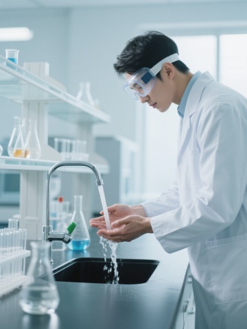 俯视角构图,极简主义实验室工作台面中央,一只戴着无菌白色丁腈手套的手正以毫米级精度操控着一支尖端极细的石英微量移液器,透明的液体弯月面在吸头末端形成完美的半球体,正悬停在一支刻有金色刻度线的硼硅酸盐玻璃试管正上方2毫米处,试管内装有三分之二体积的淡蓝色荧光溶液,底部沉淀着细密如星尘的白色颗粒,周围环绕着五只排列成正六边形的相同试管,每只试管内液体呈现出从浅蓝到靛蓝的渐变层次,背景是被柔和白光均匀照亮的浅灰色环氧树脂台面,左侧放置着一个带有蓝色LED指示灯的小型离心机,右侧是半开的磨砂玻璃试剂瓶,整个画面采用高对比度的蓝白灰三色系统,8K超高清分辨率捕捉到手套纹理和液体表面张力的微妙变化,浅景深使所有元素聚焦于移液动作的黄金分割点,营造出冷静、精准、近乎仪式感的科学美学。