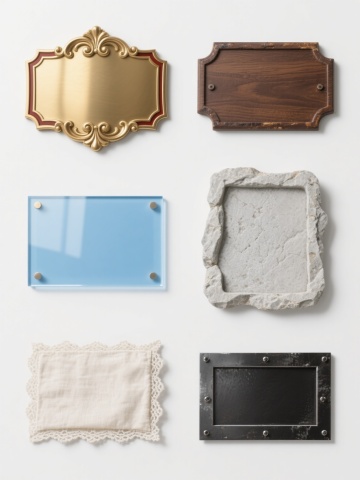 白色背景上,整齐排列六个不同样式、不同风格、不同材质的门牌。第一个门牌为金色金属材质,具有古典对称的卷草纹边框,边缘有红褐色描边,表面光滑有金属光泽,呈现出3D立体效果,光影过渡自然,高光和阴影细节丰富,整体风格华丽典雅。第二个门牌为木质材质,呈深棕色,表面有清晰的木纹肌理,边框为简约的直角线条,带有复古做旧处理,边角有轻微磨损感,风格质朴自然。第三个门牌是现代简约风格的亚克力材质,透明蓝色,无边框设计,表面光滑通透,有轻微的反光效果,显得时尚清新。第四个门牌为石材材质,浅灰色,边框为不规则的自然石纹形状,表面粗糙有颗粒感,呈现出原始自然的风格。第五个门牌是布艺材质,米白色布料,边缘有精致的蕾丝花边装饰,整体柔软轻盈,风格温馨浪漫。第六个门牌为黑色金属材质,工业风设计,边框为粗犷的直线条,表面有磨砂质感,带有铆钉装饰,风格冷峻硬朗。所有门牌大小相近,以两行三列的整齐布局排列,保持统一的视觉平衡和间距,整体构图简洁有序,信息传达清晰,具有良好的设计感和视觉层次。