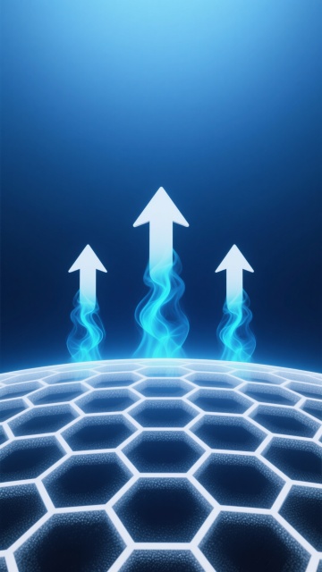 3D渲染风格,以深邃的深蓝色为主色调,搭配明亮的青色点缀,整体呈现科技感与未来感的色彩氛围。画面底部是由白色线条构成的六边形蜂窝状网格结构,网格表面带有细密的纹理,呈现出半透明的磨砂质感,网格向上延伸形成一个微微隆起的曲面。三个大小一致的白色箭头从网格表面向上发射,箭头底部喷射出由深蓝色到青色渐变的流体状烟雾,烟雾形态飘逸且富有动感,呈现出向上推进的视觉效果。背景为纯净的深蓝色渐变,从上到下颜色由浅至深,营造出广阔而神秘的空间感。整体构图采用对称式布局,三个箭头呈等距排列,形成稳定的视觉平衡,光线从上方柔和照射,使网格结构和箭头边缘产生细腻的高光,增强立体感和科技质感,画面简洁大气,传达出科技、进步与向上突破的氛围。
