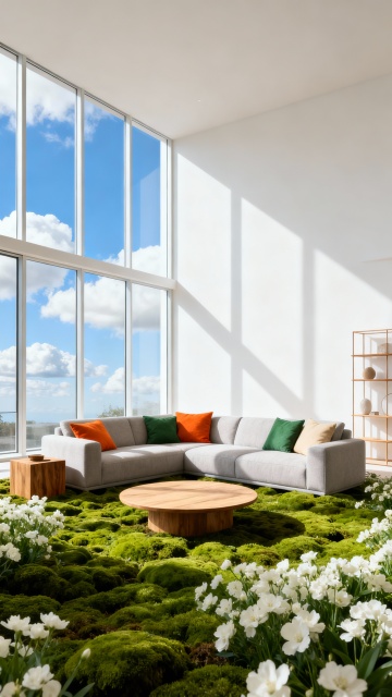 极简主义风格的白色墙面展示设计,墙上错落有致地悬挂着多个不同尺寸的相框和绿植装饰,相框内包含风景摄影图片和少量文字说明,整体呈现出简约、现代、有序的视觉效果,光线柔和明亮,空间感通透,绿植与相框形成自然与人文元素的和谐搭配,营造出清新、舒适且富有设计感的室内氛围。