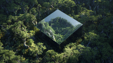 未来感与科技感交织的3D几何立方体悬浮于密林之上,玻璃材质映射自然,融合虚拟现实与超现实主义,营造静谧神秘氛围。