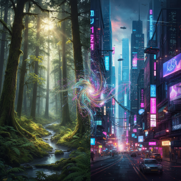 赛博朋克风未来都市,霓虹光影交织,粒子流缠绕高楼,飞行器划破云雾,虚拟现实与科技感碰撞,冲击力十足。