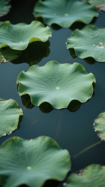 夏日池塘自然景观,写实摄影风格,画面留白50%。主体为一朵盛开的粉色荷花,花瓣边缘呈柔和的粉色渐变至中心的淡黄色,莲蓬顶部为深绿色并带有细小的孔洞。荷花下方有一片半展开的绿色花苞,花茎细长挺拔。周围环绕多片大型荷叶,荷叶呈蓝绿色,边缘有自然的波浪状卷曲,叶面展现出清晰的叶脉纹理和微妙的光影变化,部分荷叶边缘微微泛黄。整体构图简洁,色彩清新淡雅,光影柔和,营造出宁静自然的氛围,背景为大面积留白,突出主体景物的形态与质感。