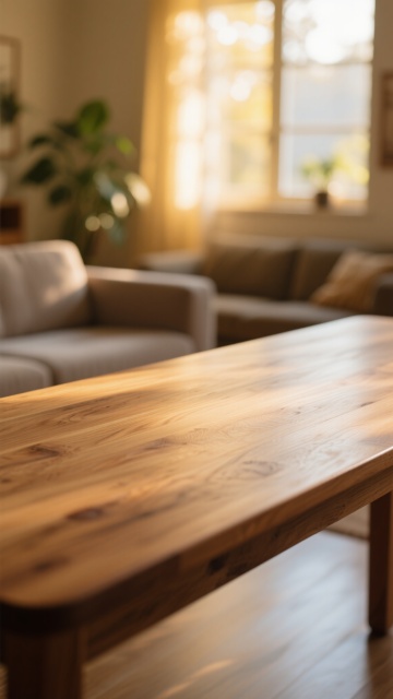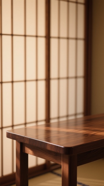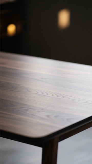 特写镜头下的深色实木餐桌,桌面木纹清晰可见,柔和的侧光从右侧木质格栅窗洒入,形成温暖的光影过渡,背景中模糊的深色屏风上隐约透出彩色光斑,整体画面呈现清冷静谧的青灰色调,营造出中式禅意空间的宁静氛围,浅景深处理使前景桌面纹理锐利而背景逐渐虚化,低饱和度色彩搭配细腻的材质质感,光线柔和不刺眼,阴影层次丰富。