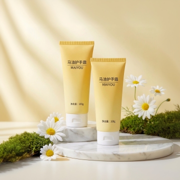 3D产品包装展示,主体为一盒紫色系大理石纹理的护手霜,包装正面有白色立体文字标题"EPIC HAND CREAM",中文标语"随身携带的手部护理",紫色椭圆形标签标注"玫瑰芬芳",背景为浅淡渐变灰,四周有斜向交叉的紫色线条装饰,整体呈现简约现代的设计风格,光线柔和,阴影细腻,突出产品质感。