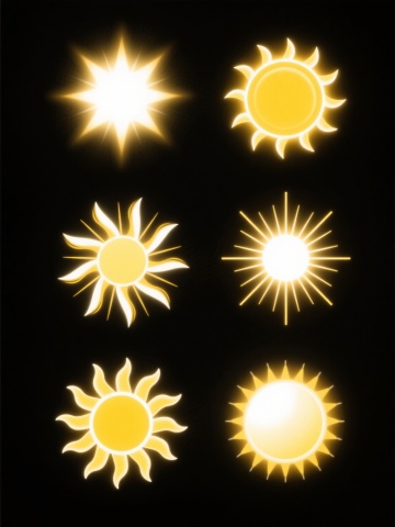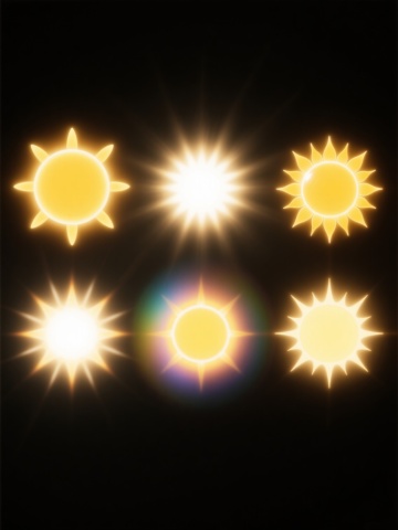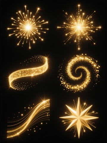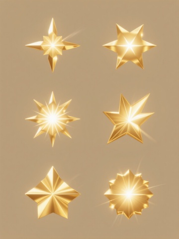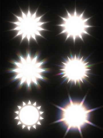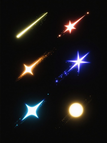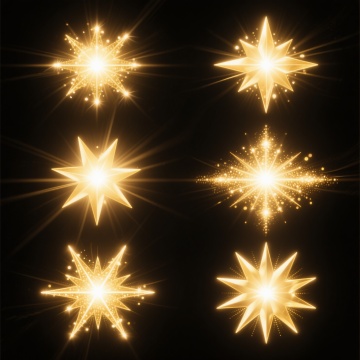 纯黑背景上,六个完全不同造型的放射状星形光效元素系列素材集合规整排布,每个星形光效都具有明亮的中心光点和向外辐射的光芒,保持数字艺术的平滑过渡质感和光影运用,整体色彩进行变换,营造出神秘幽邃的氛围,画面视觉层级清晰,信息传达效率高,符合现代设计感,图形元素简洁而富有装饰性,留白运用恰当以增强整体平衡感。