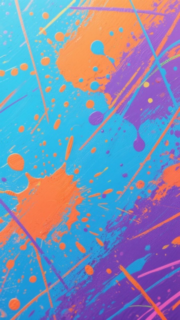 一幅抽象艺术作品,画面中心由多条色彩鲜明的倾斜色带构成,主色调为明亮的黄色、鲜艳的蓝色、热烈的橙色和明快的粉色,色带边缘带有自然的毛边效果。色彩间有部分重叠和交融,形成丰富的视觉层次。画面中散布着许多细小的彩色飞溅斑点,主要为红色和橙色,随机分布在色带周围和背景中,增强了动感和活力。整体构图呈现出一种动态的、奔放的视觉效果,色彩对比强烈且和谐。改变质感为细腻的磨砂质感,色彩过渡更加柔和,色带边缘呈现轻微的模糊渐变效果,飞溅斑点带有细微的颗粒感,整体画面在保持原有色彩和构图的基础上,展现出一种温润、内敛而不失活力的磨砂材质特性。