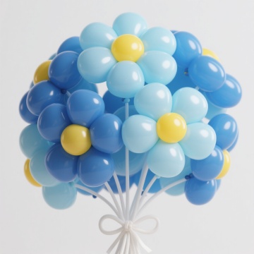 4. 透明玻璃质感:渐变蓝背景上的半透明玻璃气球组合,柠檬黄五角星气球带有磨砂圆点,薰衣草紫圆形气球,冰蓝白条纹圆形气球,蜜桃粉心形气球带有水晶星星图案,所有气球通过透明亚克力链条连接,表面呈现玻璃特有的折射光斑和气泡细节,清透色调营造出梦幻空灵的氛围