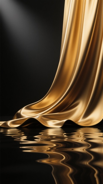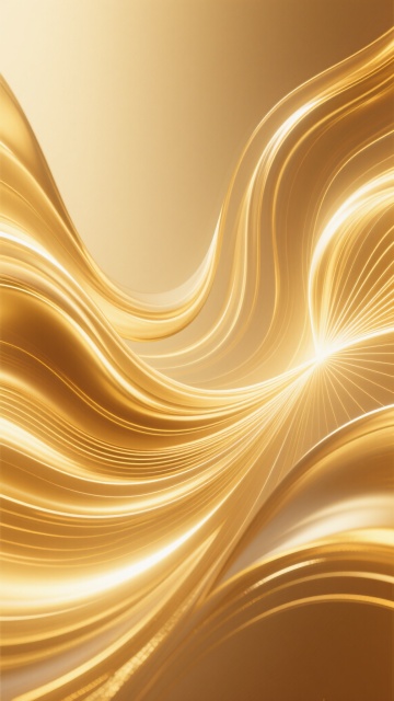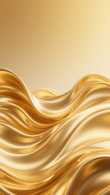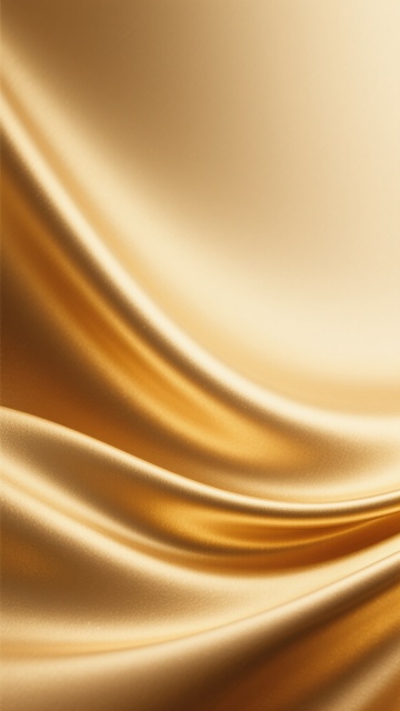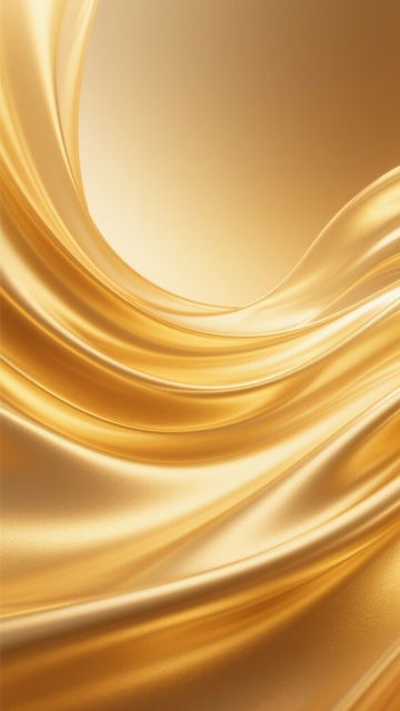 满屏流动的金色流体背景,呈现出半透明的丝绸质感,金色从浅到深渐变,带有细腻的光泽和柔和的高光,流体表面有自然的波纹和褶皱,整体散发着温暖而华丽的发光效果,现实的丝绸纹理与虚拟的流动光影交织融合,营造出梦幻而奢华的视觉氛围。