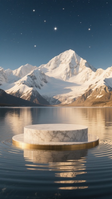 极简主义3D渲染风格,宁静神秘的氛围,湖面中央漂浮着一个表面光滑的六边形水晶平台,平台边缘有柔和的光晕,水面倒映着平台的轮廓和涟漪,远处是被柔和的粉色霞光笼罩的连绵雪山,天空呈现出从深紫到浅粉的渐变色彩,点缀着几颗明亮的星辰,整体色调以粉紫色为主,光影柔和,画面构图对称平衡,具有超现实的静谧美感。