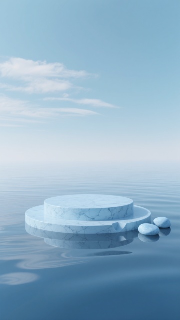 极简主义3D渲染风格的场景,整体呈现宁静优雅的氛围,柔和的光线从画面上方偏右位置照射下来,形成明亮的高光和细腻的阴影过渡,营造出温暖而朦胧的感觉。画面下方是平静的水面,水面上有轻微的波纹,倒映着上方的物体和天空。水面边缘有一个由光滑的白色岩石构成的不规则几何形状平台,平台表面平坦,边缘圆润,岩石表面有自然的纹理和细微的凹凸质感。平台旁边还有几块大小不一、形态各异的白色岩石,部分浸入水中,与水面形成自然的衔接。背景是渐变的蓝紫色天空,天空中有几朵形态柔和、边缘模糊的云彩,云彩呈现出淡紫色和浅粉色的渐变色彩,整体色调从下方的深蓝色逐渐过渡到上方的浅紫色,营造出梦幻而宁静的氛围,没有任何文字或标识元素。
