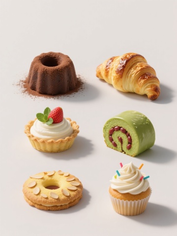 四个不同形态的精美甜点插画,水彩风格,画面明亮清新,色彩通透柔和,笔触细腻带有水润感和轻盈的晕染效果,构图为田字格布局,每个甜点独立放置在白色背景上,左上角为抹茶绿色渐变奶油裱花小蛋糕,点缀红豆和薄荷叶,右上角为蓝莓芝士慕斯杯,顶部有蓝莓酱流淌效果和新鲜蓝莓,左下角为焦糖布丁塔,带有酥脆塔底和焦糖裂纹,顶部装饰薄荷叶,右下角为芒果千层蛋糕切片,层次分明,表面铺满芒果块和淡黄色奶油花,每个甜点下都有精致的蕾丝餐垫或金色托盘,整体保持水彩特有的通透质感和柔和光影,色彩改变为抹茶绿、蓝莓紫、焦糖棕、芒果黄,形态分别为裱花小蛋糕、慕斯杯、布丁塔、千层切片