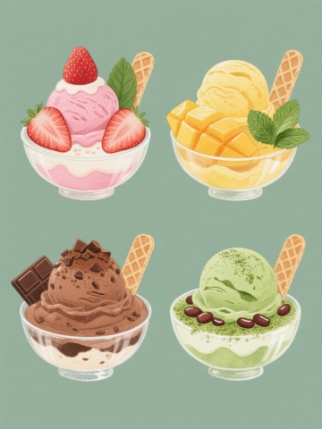 四格水彩风格插画,每格独立展示不同形态与颜色的甜点。左上角:抹茶绿色圆形抹茶慕斯蛋糕,顶部点缀薄荷叶与红豆粒,置于金色蕾丝托盘;右上角:橙黄色焦糖布丁蛋糕切片,表面淋焦糖酱,装饰橙色糖渍橙皮;左下角:紫色蓝莓芝士蛋糕切块,铺满新鲜蓝莓与白色糖霜球,底层为紫色饼干碎;右下角:粉色蜜桃千层蛋糕,每层夹有蜜桃果肉,顶部摆放蜜桃片与绿色叶子,所有甜点均保持透明水彩的湿润晕染质感,柔和光影,细腻笔触,白色背景,每格蛋糕下垫有不同花纹的白色蕾丝餐垫。