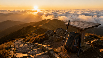 一位穿着深色户外服装的登山者背对着镜头站在覆盖着皑皑白雪的陡峭山峰之巅,俯瞰着脚下云海翻腾的壮丽山脉全景,天空呈现出温暖的橙红色调,云彩被染上柔和的霞光,整体画面采用超写实主义风格,光影效果细腻,云海与山峦的层次感分明,营造出宁静而壮阔的氛围,色调从原图的蓝白色系转变为温暖的橙红色系,保持原有的构图和细节质感。