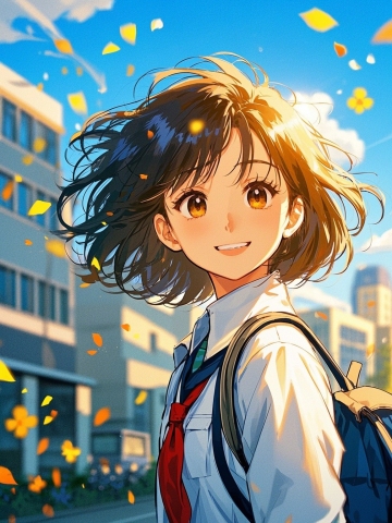 动漫风格插画,柔和明亮的光影,粉色樱花飘落的唯美背景,蓝白渐变的天空,少女双马尾发型,白色衬衫搭配蝴蝶结领结,双手举起的动态姿势,细腻的面部表情刻画,透明感的樱花花瓣,阳光透过花枝的光斑效果,柔和的线条轮廓,温暖治愈的氛围,高饱和度的色彩搭配,层次感丰富的构图,飘落的樱花形成的动态效果,少女眼中的高光细节,整体画面的梦幻感,精致的服饰纹理,背景樱花树的细节描绘,天空中飘散的花瓣,少女微微仰头的视角,柔和的阴影处理,画面整体的通透感,符合动漫插画的细腻笔触,樱花与少女的和谐融合,粉色与蓝色的色彩对比,阳光照射下的明亮感,飘落花瓣的层次感,少女头发的飘动效果,背景的纵深感,整体画面的平衡构图,樱花花瓣的半透明质感,阳光的散射效果,符合动漫美学的人物比例,背景樱花的密集与疏朗对比,画面的动态与静态结合,温暖的色调处理,少女表情的纯真感,樱花飘落的自然轨迹,背景天空的渐变色彩,整体画面的清新感,符合动漫风格的光影处理,樱花与人物的互动感,画面细节的丰富性,整体氛围的宁静美好。
