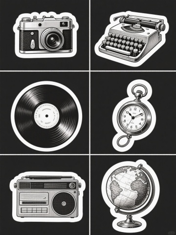 一组六个同风格同类目的图标系列素材集合,每个图标均采用极简主义的剪影风格,以单一纯色填充,线条流畅圆润,边缘清晰无渐变,背景为纯色且与图标颜色形成鲜明对比,六个图标呈规整网格排布;第一个图标是黑色的复古电话听筒,第二个是黑色的老式相机,第三个是黑色的磁带录音机,第四个是黑色的唱片机,第五个是黑色的打字机,第六个是黑色的收音机,所有图标均保持相同的简约剪影设计语言和视觉权重,整体画面简洁明快,信息传达直接高效。