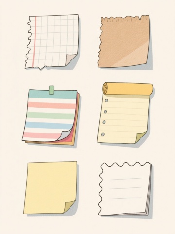 一系列6个完全不同造型配色的手绘风格空白便签本素材集合,每个便签本均保持相同的基础元素:顶部带有四个金色金属活页环、米白色纸张底色、黑色手绘轮廓线条,整体采用规整的网格状排布。每个便签本拥有独特的设计变化:1. 粉色纸张配蓝色活页环与波浪形轮廓;2. 黄色纸张配红色活页环与圆角方形轮廓;3. 蓝色纸张配绿色活页环与锯齿形边缘;4. 绿色纸张配紫色活页环与云朵形顶部;5. 紫色纸张配橙色活页环与圆形边角;6. 橙色纸张配粉色活页环与矩形基础带装饰花纹。所有便签本均为纯色背景,保持一致的手绘质感和简约风格,整体布局整齐有序,适合作为系列模板素材使用。