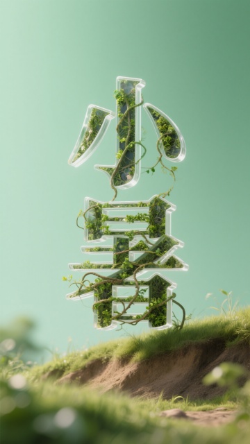 清新中式3D风,大字“小暑”以绿叶呈现,虚拟自然与水墨意境融合,夏日氛围浓厚。