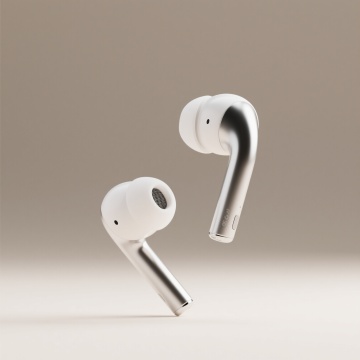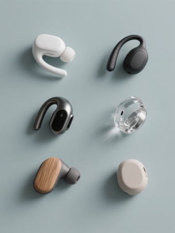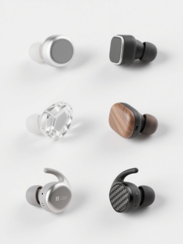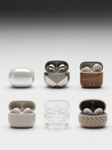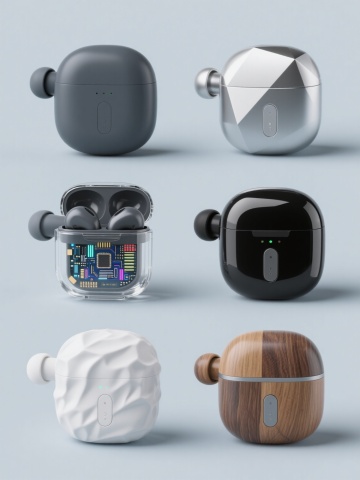 6款不同材质与造型的无线耳机及其充电盒组成的系列产品集合,在纯白色纯色背景上以规整的网格状排布。每款耳机都保留核心的入耳式耳塞与充电盒开合形态,但具有完全独特的设计造型:1. 高光泽钢琴漆材质,棱角分明的几何切割充电盒,耳塞表面有精细的菱形切割纹路;2. 哑光磨砂金属材质,圆润流畅的鹅卵石造型充电盒,耳塞带有金属网面装饰;3. 透明亚克力材质,半透明充电盒可看到内部结构,耳塞采用渐变色彩设计;4. 编织纹理布艺包裹材质,方形充电盒带有缝线细节,耳塞表面有细密的针织纹路;5. 木质纹理材质,圆角矩形充电盒搭配原木色,耳塞表面有自然木纹肌理;6. 荧光霓虹材质,不规则多边形充电盒,耳塞带有发光灯带边缘,整体呈现科技感十足的未来主义造型。所有产品均采用简约无Logo设计,保持一致的光影效果,柔和的顶部光源,轻微的底部阴影,突出产品的材质质感与设计细节,形成统一而富有变化的系列感。