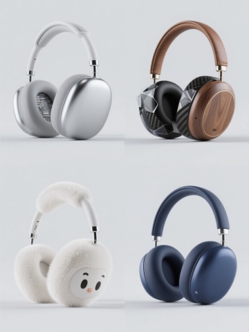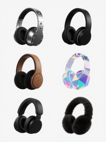 一张展示六个不同材质与造型头戴式耳机的系列海报,保持高分辨率3D产品渲染风格,纯净纯色背景,每个耳机均保留头戴式基本结构但造型各具特色:第一个为银色金属拉丝质感,流线型耳罩;第二个是哑光黑色碳纤维材质,棱角分明的几何切割设计;第三个呈现温暖的胡桃木纹理,复古圆形大耳罩配皮革头梁;第四个为透明亚克力材质,内部可见精密电路结构,未来科技感造型;第五个是柔软的白色绒毛材质,蓬松可爱的卡通化造型;第六个为深蓝色磨砂陶瓷质感,简约椭圆耳罩配纤细金属支架。整体构图采用2x3网格规整排布,每个耳机占据相同大小空间,光线统一从左上方45度角照射,形成柔和阴影,突出各材质的独特质感与细腻细节,整体视觉层次清晰,信息传达直接,设计感现代简约,适合科技产品宣传。