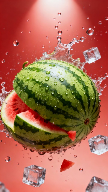 高清商业摄影风格,晶莹饱满的深紫色葡萄,部分成串带绿色果柄,部分散落,表面光滑并附着水珠,与透明立方体冰块一同悬浮在柔和渐变的粉紫色背景中,动态飞溅的水花及大量圆润水珠散布画面,光线从上方柔和照射,形成葡萄和冰块表面的高光与细腻阴影,整体营造出清凉、新鲜、富有活力的氛围,画面干净通透,色彩和谐统一,具有强烈的视觉冲击力和质感表现。