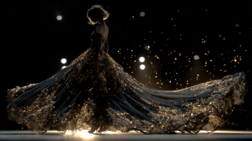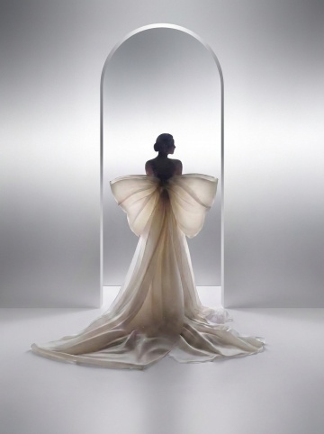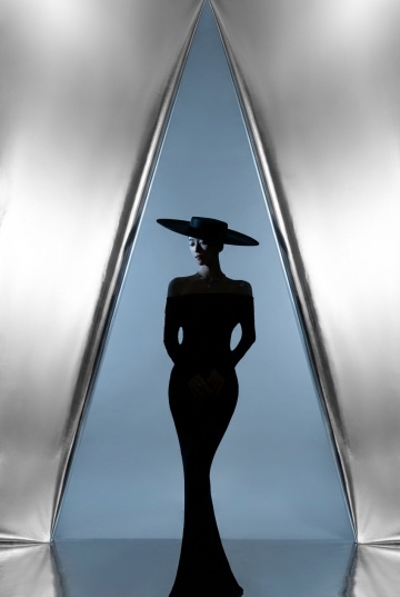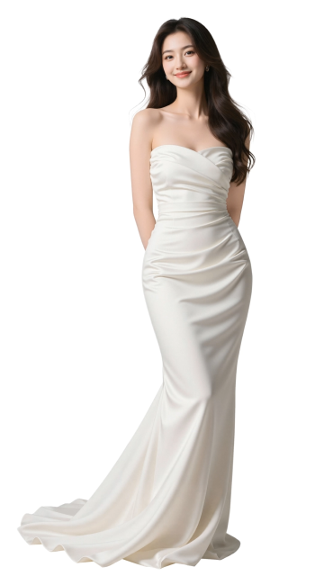 一位女性侧身站立,头戴宽大黑色礼帽,帽檐遮住面部,单手叉腰,姿态优雅。她身着一袭酒红色丝绒吊带长裙,裙摆呈鱼尾状自然垂落并拖曳于地,面料光泽柔和,褶皱层次丰富。整体画面为纯白色背景,光线明亮均匀,突出主体人物的优雅轮廓与服装的质感,营造出简约高级的时尚氛围。