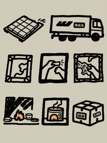 一系列6个中国传统茶具主题的插画,保持原有的水墨手绘风格,粗重有力的黑色轮廓线条,内部填充以不同的纯色,背景为单一纯色。每个插画中的茶具元素完全不同,包括茶壶、茶杯、茶盘、茶叶罐、公道杯、盖碗等,元素类目保持茶具相关。所有插画规整地排布在一起,形成一个统一的系列素材集合。
