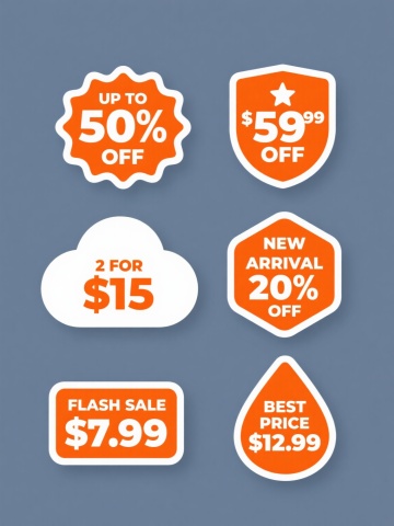 纯色背景,保持橙色主色调与白色文字的高对比度,六个不同造型的促销标签规整排布成系列素材集合。每个标签均延续圆润边角、简洁无衬线字体的现代设计风格,保留"折扣"核心元素但数值与文案各异:1. 波浪形边框标签配"UP TO 50% OFF"及大号数字"50";2. 盾形徽章式标签突出"$9.99"并加星形装饰;3. 云朵造型标签展示"2 FOR $15"特惠信息;4. 六边形标签标注"NEW ARRIVAL 20% OFF";5. 圆角矩形标签呈现"FLASH SALE $7.99";6. 水滴状标签强调"BEST PRICE $12.99"。所有标签保持统一的视觉层级,文字大小对比鲜明,关键数字采用加粗放大处理,整体风格协调且每个标签造型独特,适合作为促销系列素材使用。