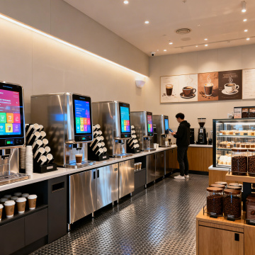 现代简约咖啡馆,清新舒适实景感,员工微笑服务,体现简约主义风格。