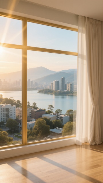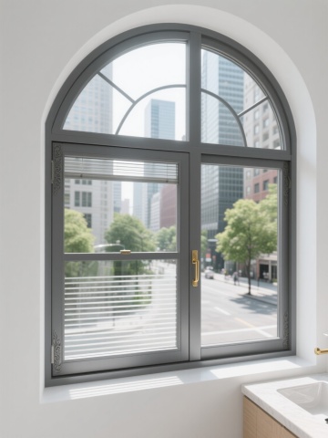 一张现代风格的室内窗户特写照片,采用高清晰度3D渲染技术,光线明亮柔和,以自然光为主,从窗外照射进来,营造出通透、干净的氛围。窗框材质为深灰色金属,表面光滑带有细微的哑光质感,搭配一个金色的金属把手,位于窗框右侧中间位置。窗外是城市景观,有高楼大厦、绿树和街道,但窗户本身的构造为全新设计的样式——[请在此处插入您希望的全新窗户构造描述,例如:上下推拉式双层玻璃窗,带有横向分隔条和内置百叶帘;或左右对开式拱形玻璃窗,边缘有精致的雕花装饰;或不规则多边形全景落地窗,无明显分隔但有隐藏式边框]。室内墙体为纯白色,窗台下是浅色的洗手台一角,整体画面构图平衡,色彩以黑白灰为主色调,辅以窗外的自然绿色和建筑色彩,视觉层级清晰,窗户作为主体被突出展示,细节丰富,真实感强,符合现代家居设计的审美和展示需求。