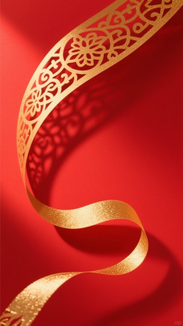 一幅以中国传统剪纸风格呈现的红色背景设计,整体采用正红色作为主色调,搭配金色作为点缀,营造出喜庆而庄重的氛围。画面上方以精细的剪纸工艺呈现出流畅飘逸的金色曲线,线条边缘带有细腻的镂空纹理,如同被精心裁剪的金箔丝带在红色背景上优雅舞动。光影效果方面,金色曲线从左上角向右下角延伸,左侧受强光照射呈现出明亮的高光,右侧逐渐过渡为柔和的阴影,形成明显的明暗对比,增强了画面的立体感和空间层次。红色背景并非单一色块,而是通过细微的渐变处理,从中心向四周呈现出由深到浅的色彩变化,中心区域颜色浓郁深沉,边缘则稍显明亮,仿佛光线从四周柔和地渗入。整个设计简洁大方,剪纸的镂空质感与光影的巧妙结合,既保留了传统元素的韵味,又展现出时尚现代的视觉美感,适合作为节日庆典或重要活动的背景使用。