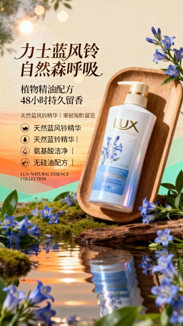 特写镜头,晨露未晞的青石板上,一只纤细的女性手指正轻触一支磨砂质感的陶瓷香薰瓶,瓶身呈现柔和的象牙白,金属盖头是哑光玫瑰金,瓶口萦绕着一缕淡紫色的袅袅烟雾,宛如清晨的薄雾。瓶身正面烫金小字"LINNEA"与手绘铃兰图案相映成趣,瓶底散布着三粒饱满的薰衣草籽。周围是带着露水的迷迭香枝条、浅紫色勿忘我和几片卷曲的尤加利叶,背景是朦胧的晨雾森林,光线从树冠间隙斜射而下形成丁达尔光束,空气中悬浮着细小的香氛分子。海报上方是银灰色手写体标题"森呼吸·自然平衡香薰",下方为"【限量礼盒含同款精油皂】",右侧两个水滴形标签分别标注"100%植物精油"和"72小时缓释香气",底部三行短语采用纤细衬线体:"疗愈情绪 舒缓压力"、"天然植萃 温和不刺激"、"持久扩香 萦绕身心"。整体色调以象牙白为基底,搭配薰衣草紫与橄榄绿的渐变,营造出静谧治愈的森林系氛围。