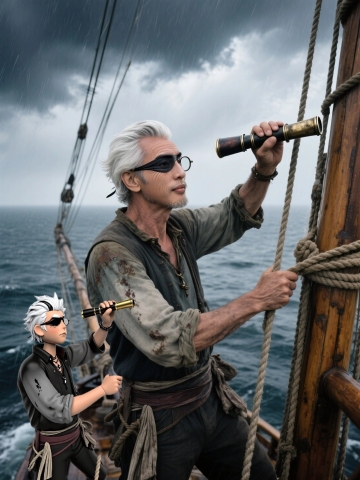人物头发白色,发型三七分,微分碎盖,戴着无镜片金属眼镜,磨损严重,一只眼戴着海盗眼罩;背景是海盗船上,人物在船桅杆最顶端,一手拿着望远镜,一手拉着桅杆;船在海面上,海面雷雨;远景;人物年龄40,面部有皱纹